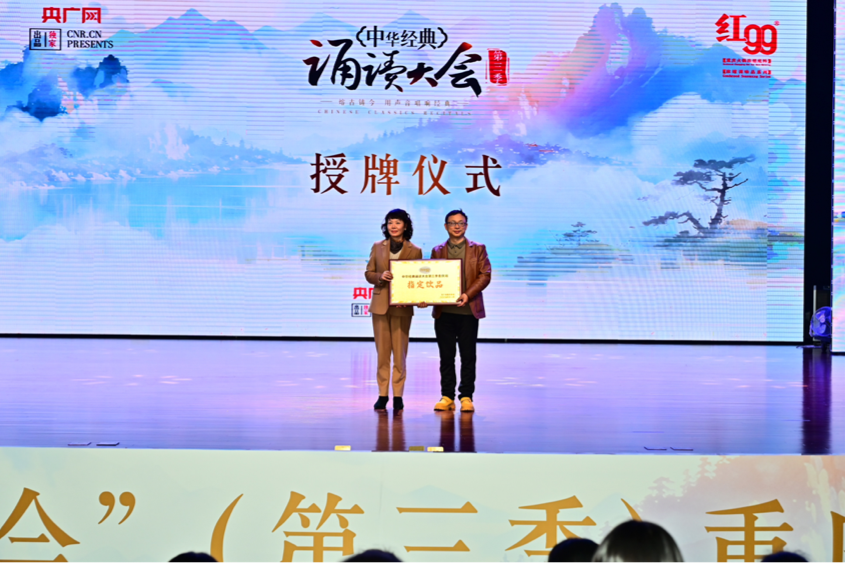 活動現場,央廣網副總裁朱建勇、央廣網重慶頻道負責人周偉分別為中華經典誦讀戰略合作伙伴重慶紅九九食品有限公司、指定飲品荷包蛋授牌。
