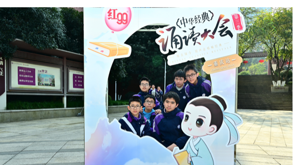 學生在中華經典誦讀大會戶外打卡點合影(央廣網記者 王海 攝)