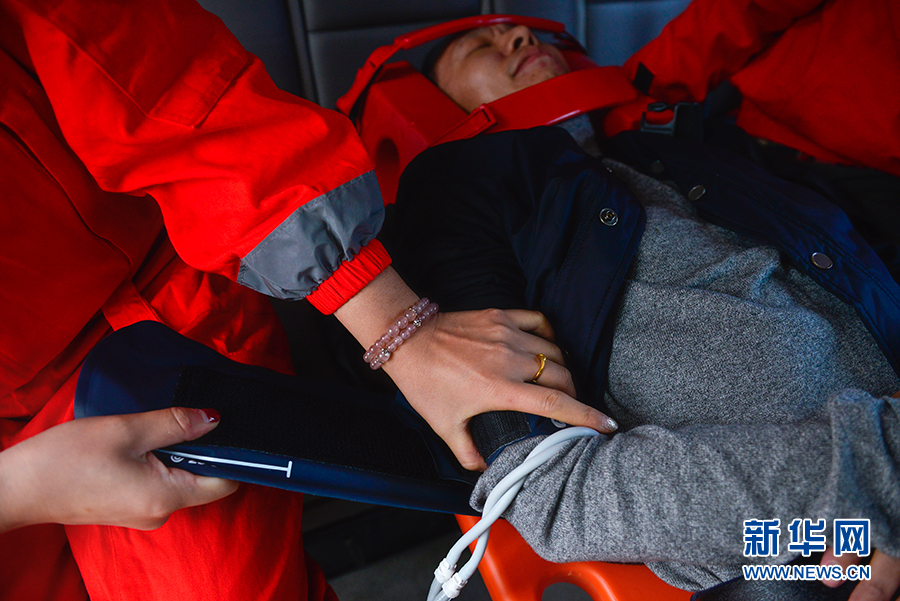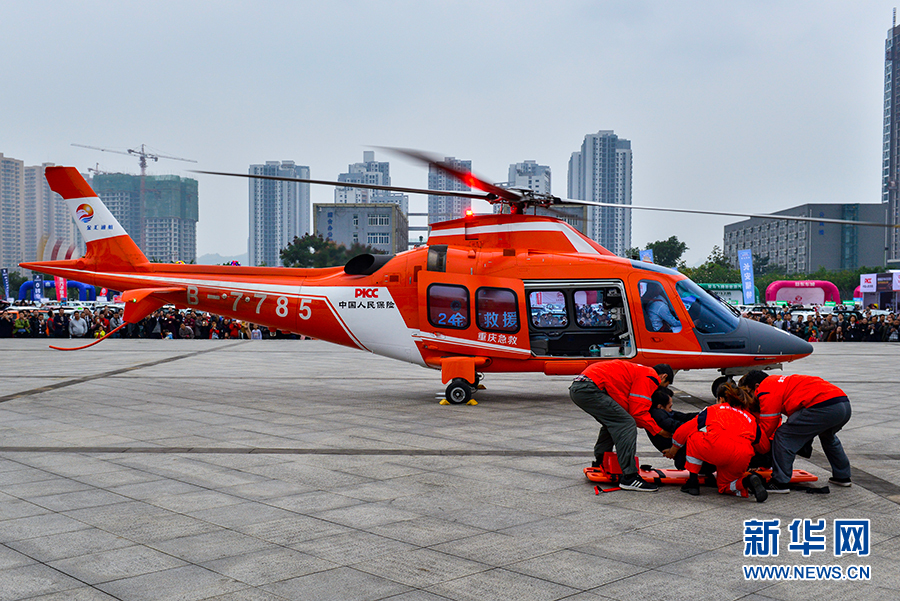 11月12日,航空應(yīng)急醫(yī)療救援在重慶市璧山區(qū)舉行,轉(zhuǎn)移到直升機(jī)后,救援人員對(duì)病人實(shí)施必要的急救措施。新華網(wǎng) 李相博 攝 -