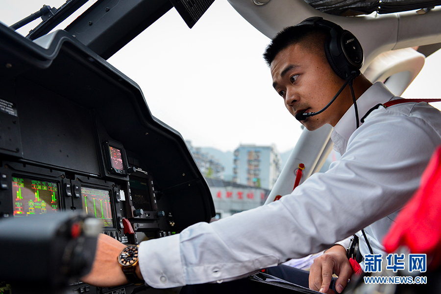11月12日,航空應(yīng)急醫(yī)療救援在重慶市璧山區(qū)舉行,圖為執(zhí)飛機(jī)長(zhǎng)進(jìn)行飛行前的確認(rèn)檢查。新華網(wǎng) 李相博 攝 -