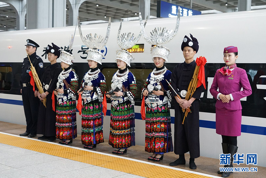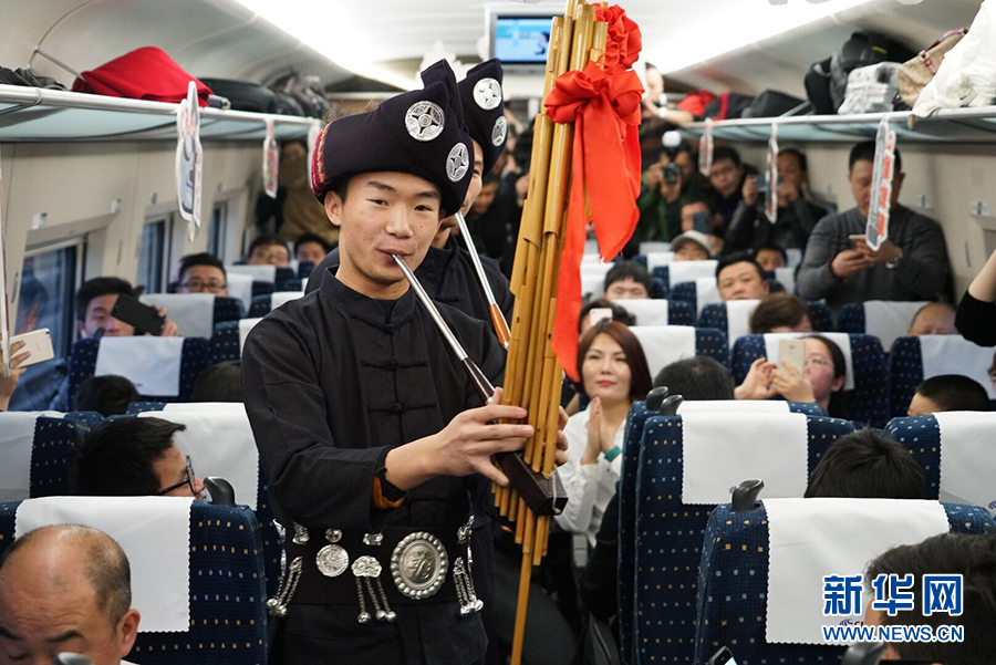 渝貴鐵路25日正式開通,重慶始發的D8581次實現2小時直達貴陽。圖為車廂內的吹奏蘆笙表演。新華網 張免 攝 -