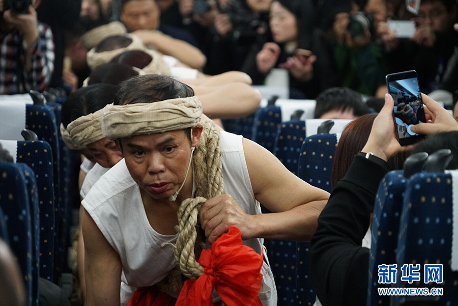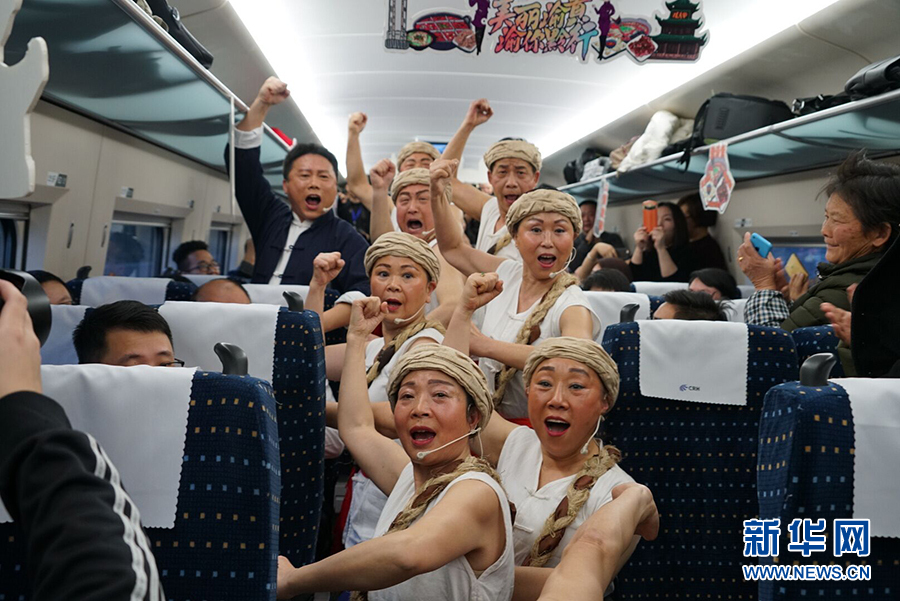 渝貴鐵路25日正式開通,重慶始發的D8581次實現2小時直達貴陽。圖為車廂內的川江號子表演。新華網 張免 攝 -