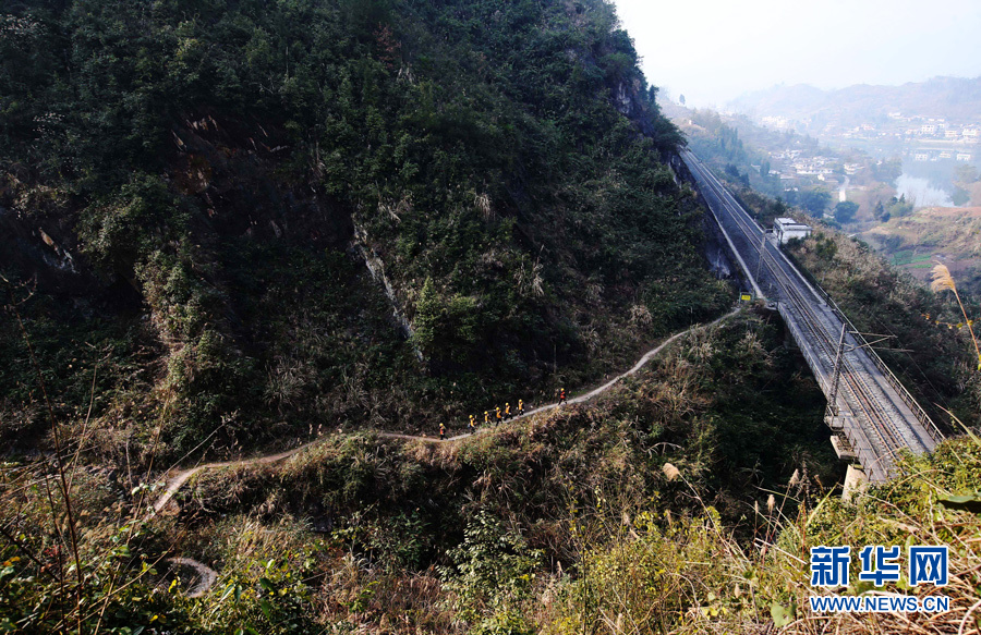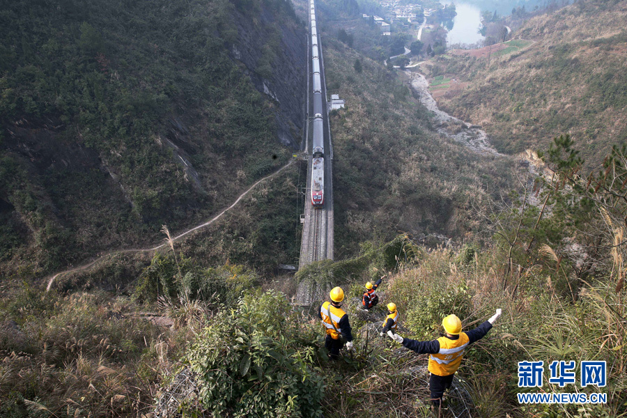 2月7日,在重慶市黔江區細塘灣山,中國鐵路成都局集團公司涪陵工務段黔江危石整治工區工人在觀察春運列車通過。新華網發(楊敏 攝) -