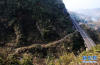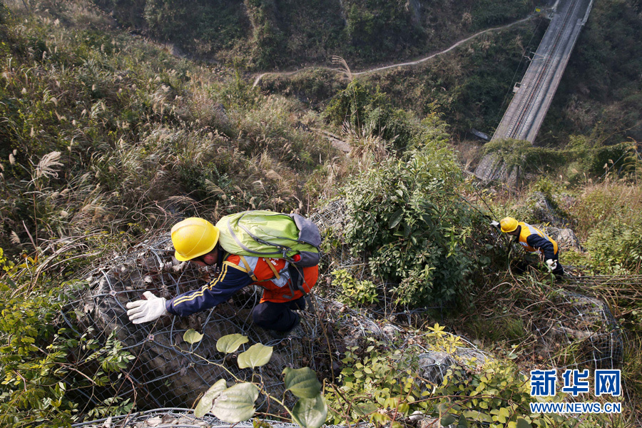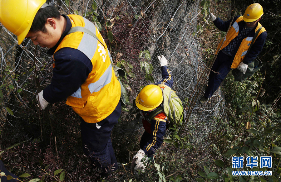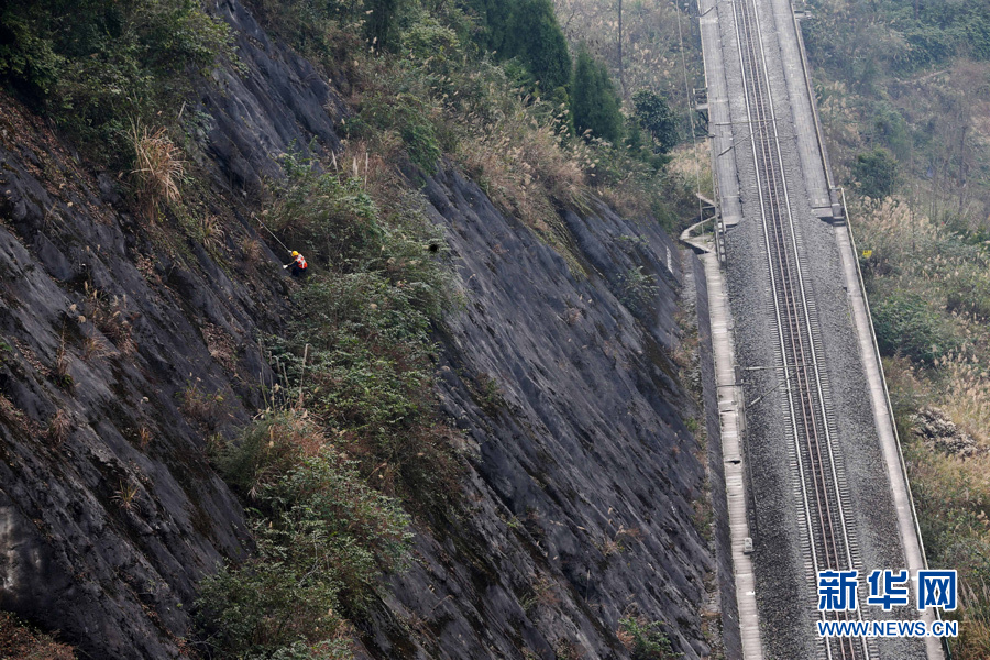 2月7日,在重慶市黔江區細塘灣山,中國鐵路成都局集團公司涪陵工務段黔江危石整治工區工人在搜山排危。新華網發(楊敏 攝) -