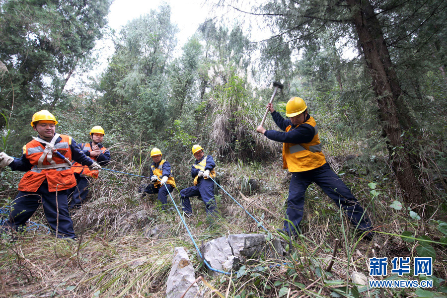 2月7日,在重慶市黔江區細塘灣山,中國鐵路成都局集團公司涪陵工務段黔江危石整治工區工長彭錦(前)在搜山排危。新華網發(楊敏 攝) -