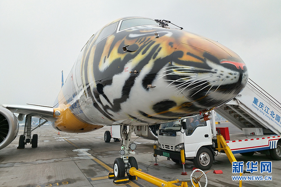 2月12日早上08:30分,一架外觀噴涂為老虎的巴西航空工業ERJ-190-E2客機降落重慶江北國際機場,在經過近3小時停留加油后,于11:16分安全起飛前往哈薩克斯坦。據了解,這次停留主要是給飛機補充燃油。飛機從新加坡起飛,經停重慶“吃飽喝足”后,飛往哈薩克斯坦阿拉木圖進行下一站演示。新華網發(重慶江北國際機場供圖)