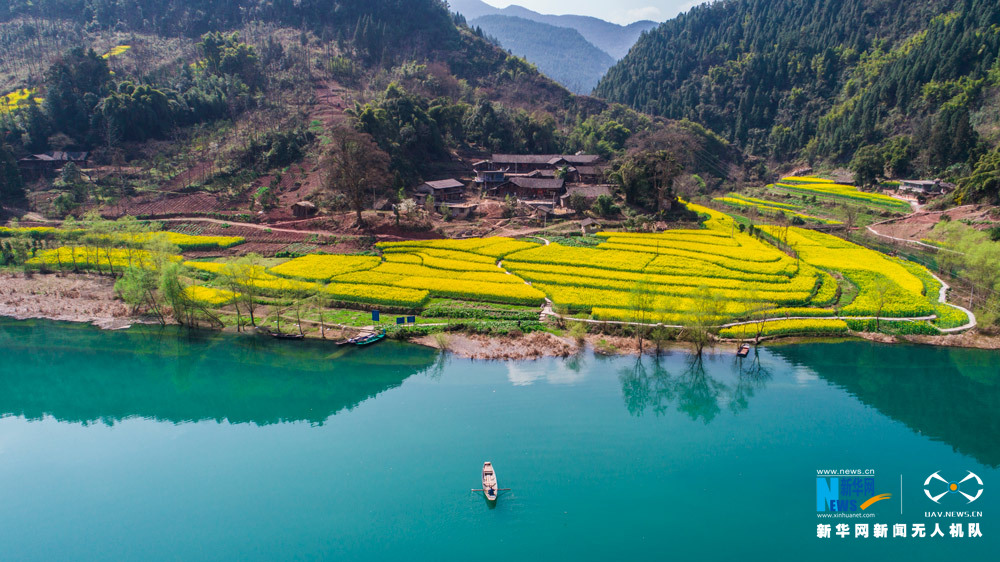陽春三月,春水初生,花海漸盛。在重慶市黔江區阿蓬江畔,油菜花海沿著江岸蔓延開來,正是半江春色半江水。圖為無人機航拍重慶阿蓬江春色,詩情畫意濃。新華網發(王江龍 攝) -