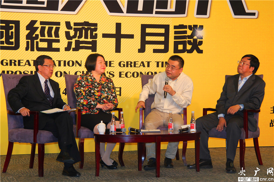 左一:中國入世談判首席談判代表、原博鰲亞洲論壇秘書長 龍永圖;左二:商務部國際貿易經濟合作研究院副院長 邢厚媛;右一:經濟之聲代表 楊春陽;右二:《首席財務官》雜志出版人兼總編輯 田茂永(央廣網 李靜/攝)