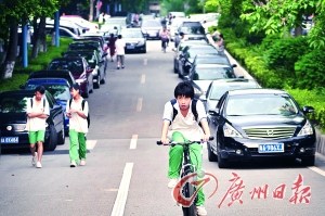 校門前排滿豪車,基本都是從小區(qū)開車,再開回小區(qū)。