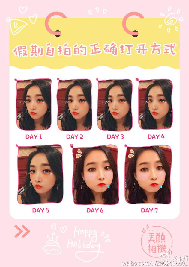 10月16日晚,宋茜通過(guò)微博曬出自拍照,實(shí)力詮釋7天假期生活。照片中,假期第一天還是美美的瘦瘦的,第二天似乎也沒(méi)什么變化,但隨著假期一天天過(guò)去,臉蛋也越來(lái)越胖,到第七天已明顯變成大圓臉。