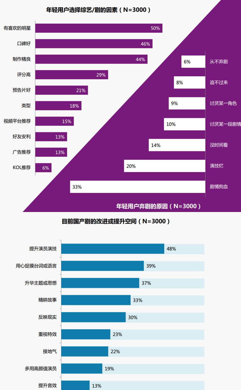 比較出乎意料的是,素以“顏控”來標榜自己的年輕用戶,對好劇的評判標準,早已不停留于“顏值即正義”,變得相當挑剔。報告顯示,雖然明星依然是年輕用戶選劇的重要參考因素,但狗血劇情和“感人”演技卻是用戶的第一棄劇理由。作為看著美劇、吃著漢堡長大的一代,年輕用戶對網絡劇和網絡綜藝的鑒賞能力同步提升,單純依靠卡司、高顏值、“粉絲濾鏡”來制造爆款的粗暴邏輯已不適用于當下。