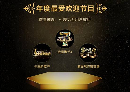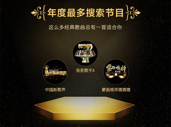 《我是歌手4》張信哲、李玟、李克勤大牌唱將云集,《中國新歌聲》周杰倫、汪峰、庾澄慶、那英四大導師鎮場,《蒙面唱將猜猜猜》譚晶、黃綺珊、林宥嘉實力擔當,隨著節目的播出,好歌不斷占據酷狗榜單半壁江山,年度最受歡迎節目、年度最多搜索節目前三甲實至名歸!