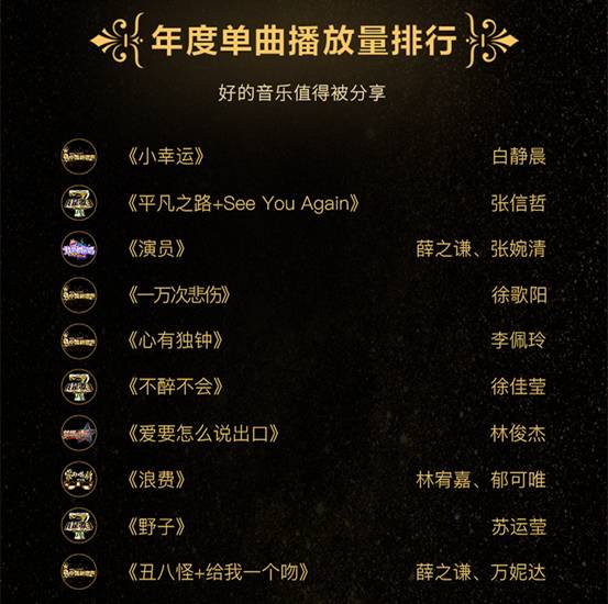 小鮮肉白靜晨的《小幸運》、情歌王子張信哲的《平凡之路+See You Again》、謙謙君子薛之謙與素人張婉清合唱的《演員》,一舉斬獲酷狗年度單曲播放量排行榜前三。而行走的CD林俊杰與汪峰愛徒徐歌陽,繼年度單曲評論數排行榜后,再次實力入選年度單曲播放量排行榜!