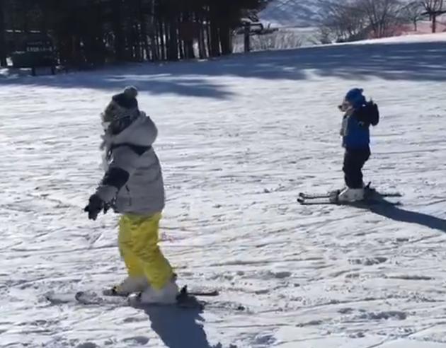 2月1日晚,鄧超曬出一雙兒女第一次滑雪的視頻,并配文:“霸王花和等哥第一次滑雪。”