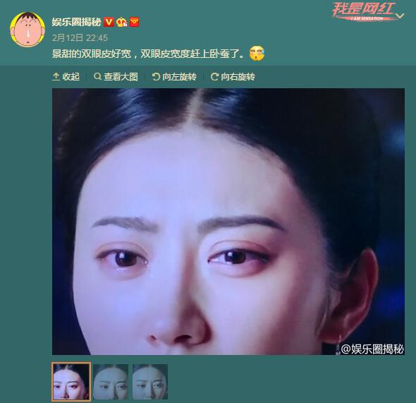 2月13日,有微博網友曬出景甜在《大唐榮耀》中表演的截圖,并評論:“景甜的雙眼皮好寬,雙眼皮寬度趕上臥蠶了。”景甜為新戲毀容 打完吊瓶就開工!