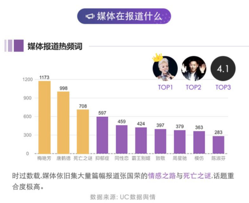 從大數據可以看到,張國榮離世14年,最受媒體關注的還是他身前的感情,以及死亡原因。排名前三的分別是梅艷芳、唐鶴德和死亡之謎。