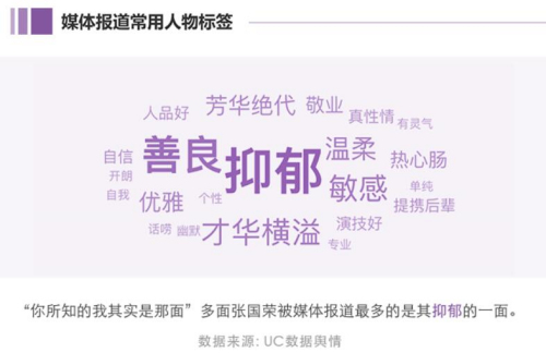 此外,UC大數據顯示,芳華絕代、才華橫溢、真性情、善良等等形容人美好的詞匯集于張國榮一身。其人格魅力的折射,粉絲對他經年不忘。據了解,張國榮的粉絲已遍布海內外,今年就有日本粉絲折疊912只藍色千紙鶴為其祈福。