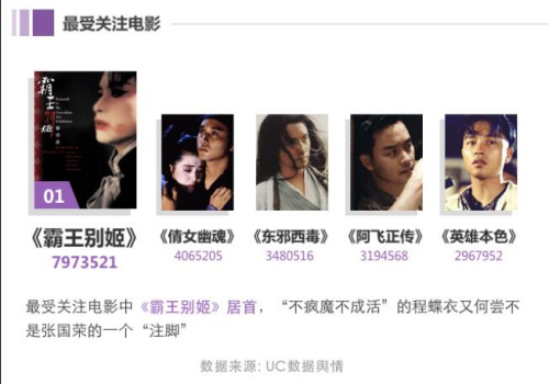 在最受關注的作品中,粉絲較為關注張國榮主演的《霸王別姬》《倩女幽魂》等電影和演唱的《風繼續吹》《當年情》等曲目。這些作品不僅在香港電影和流行歌曲的黃金時代中留有濃墨重彩的一筆,在中國文娛發展史上,皆有一席之地,堪稱經典。據了解,張國榮在演《霸王別姬》時,被評價“把靈魂投入到了角色里”。不難理解,粉絲對其作品的高關注度,有其演繹直擊人心的原因。
