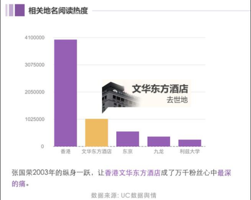 在UC相關地名閱讀熱度圖中顯示,除卻去世地香港文華酒店粉絲較為關注外,其長居地香港和演唱會舉辦地東京等,也成為粉絲緬懷他的地方。