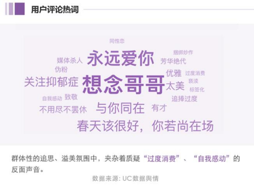 張國榮逝世14年,熱度未減,每年都有大規模的追憶活動和報道。值得探究的是,在UC用戶評論熱詞中,除了主流的表達“想念哥哥、永遠愛你、與你同在”等追思之詞,但同時也有不少網友對每年一次“緬懷張國榮”的現象發出了“追捧過度、媒體殺人、過度消費”等質疑的聲音。