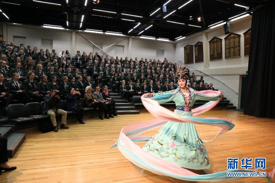 “2017年中國文化周”走進新西蘭校園 5月8日,在新西蘭惠靈頓,黑龍江省京劇院演員在塞繆爾·馬斯丹女校表演京劇水袖。由新西蘭中國文化中心、黑龍江省文化廳舉辦的“2017年中國文化周”活動8日走進新西蘭校園,中國京劇演員與惠靈頓塞繆爾·馬斯丹女校學生同臺表演。新華社發(孟韜攝)