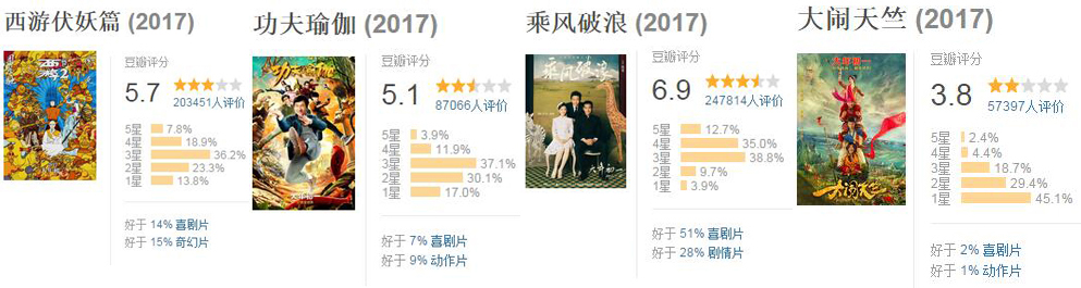 2016年的中國電影市場在眾多“聲音”和“現象”中結束,2017春節檔成為觀眾期待的電影盛宴,《西游伏妖篇》、《功夫瑜伽》、《大鬧天竺》、《乘風破浪》等影片吊足了觀眾胃口,但這聲勢浩大的表象背后卻依然是讓觀眾差強人意的質量。除《乘風破浪》后來居上實現口碑票房逆襲外,其余影片均沒有獲得觀眾好評,豆瓣評分均未過及格線,《大鬧天竺》更是只收獲3.8分。回想《大鬧天竺》深入三四線城市“60天50城”的賣力宣傳,隱約透出一絲尷尬的氣息。