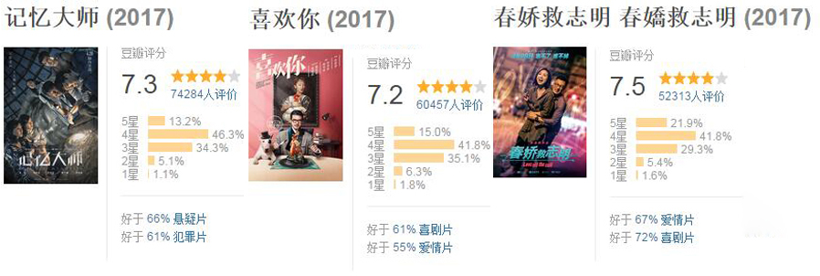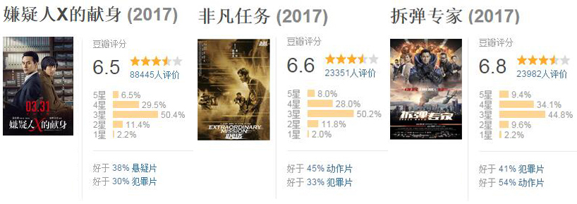 值得安慰的是國產電影并沒有表現出持續低迷的狀態, 《嫌疑人X的獻身》6.5分、《拆彈專家》6.8分、《記憶大師》7.3分、《非凡任務》6.6分、《喜歡你》7.2分、《春嬌救志明》7.5分 ,影片評分走出低谷,收獲觀眾的認可。