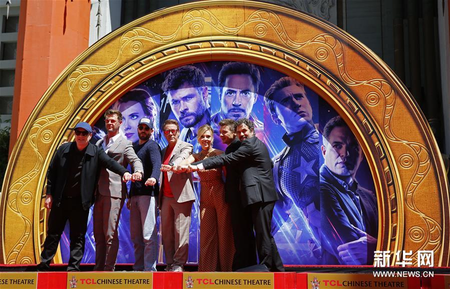 4月23日,在美國洛杉磯好萊塢TCL中國劇院門口,漫威影業總裁凱文·費奇、演員克里斯·海姆斯沃斯、克里斯·埃文斯、小羅伯特·唐尼、斯嘉麗·約翰遜、杰瑞米·雷納、馬克·魯法洛(從左至右)參加留印儀式。當日,《復仇者聯盟4:終局之戰》部分演員在好萊塢TCL中國劇院門口留下手印。新華社記者 李穎攝