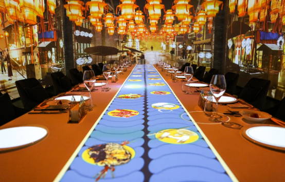 在技術層面,光影主題餐廳通過環形拼接和桌面投影的方式,在餐廳四圍及餐桌桌面進行激光投影。主題場景采用三維和二維動畫的視頻制作,并進行高清效果渲染,營造沉浸式的用餐環境。