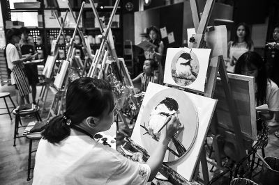走出陶藝社不遠,“同或”繪館迎面而至。找一塊尺寸合適的畫布,支起畫架,就可以在畫布上隨心所欲創作了。一位沒有任何繪畫基礎的女生花了三個小時就點染出一幅“桃花圖”。店家半開玩笑說,她的畫作頗有幾分知名畫家周春芽的影子,后者的“桃花”系列是國內藝術拍賣場的熟客。從繪畫館出門轉個彎兒,就是一家舞蹈培訓室,幾乎每天都有七八人在這里練習國標、探戈或是拉丁,教師悉數為科班出身。