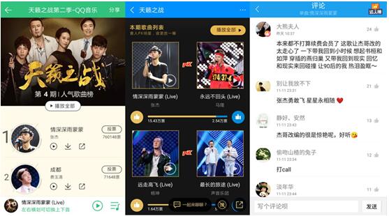 11月11日晚,大型星素勵志音樂節目《天籟之戰2》第四期播出,改檔周六好戲提前,但比拼仍然激烈:“天籟唱將”莫文蔚、費玉清、楊坤、張杰再度集結,迎戰民間歌者,華晨宇則在本期休戰。作為《天籟之戰2》專享音頻合作方及互動平臺,騰訊音樂娛樂集團旗下三大平臺QQ音樂、酷狗音樂、酷我音樂也如約同步上線節目音頻,吸引了大批網友前來為喜愛的歌曲打榜。