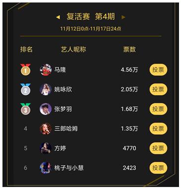 而終于如愿挑戰杰哥的馬隆以一首慷慨激昂的《永遠不回頭》應戰,雖然得到張杰的肯定:“你今天的表現我可以給你打滿分”,但終究以301票不敵張杰戰敗。慘遭淘汰的馬隆在賽后采訪遺憾表示:“我想晉級,晉級之后我還可以再挑戰杰哥”。好在酷狗直播已經開啟獨家網絡復活通道,第四期播出后,馬隆也迅速獲得酷狗網友4.5萬票的支持登頂第一,再次與杰哥同臺演出指日可待。