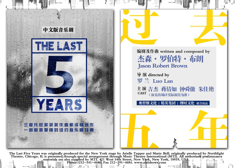 音樂劇《過去五年》由三度獲得托尼獎的杰森·羅伯特·布朗于2001年創作,講述了一對戀人在五年間的情感波折。音樂與故事的完美結合,正敘和倒敘穿插的雙線敘事,使這出劇獲得了紐約劇評人和觀眾的一片好評,并一度成為全球被排演次數最多的音樂劇之一。2015年,該劇被搬上電影銀幕,由安娜·肯德里克和杰瑞米·喬丹主演。