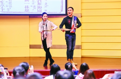 上海昆劇團(tuán)演員黎安(右)、羅晨雪為學(xué)子們現(xiàn)場(chǎng)表演 記者許魏巍 攝