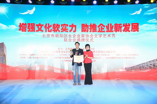 朝陽區文聯主席謝瑩向朝陽區女企協首屆文聯主席蔡國慶頒發聘書。