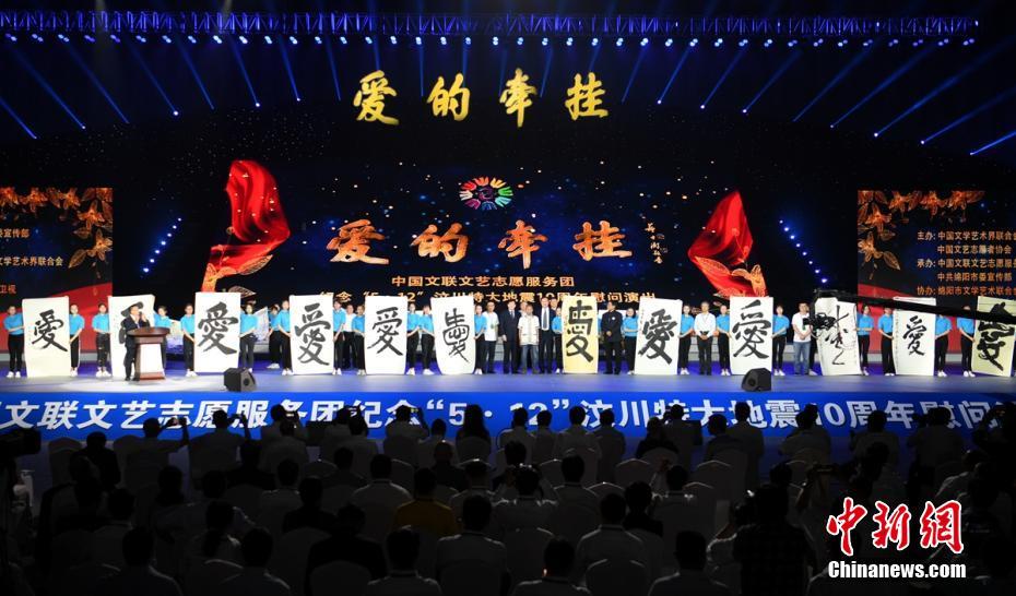 5月7日晚,“5.12”汶川特大地震10周年之際,中國(guó)文聯(lián)組織文藝名家走進(jìn)四川綿陽(yáng),拉開了“愛的牽掛”序幕。活動(dòng)現(xiàn)場(chǎng),志愿者們贈(zèng)送了12幅寫著“愛”字的書法作品,同時(shí)還贈(zèng)送攝影和書畫作品。張國(guó)立、張凱麗、康輝、張蕾、姜昆、張也、李丹陽(yáng)、呂繼宏、佟麗婭、霍勇等藝術(shù)家以文藝志愿者身份,現(xiàn)場(chǎng)為觀眾獻(xiàn)上了精彩的文藝表演。據(jù)悉,為更好地服務(wù)廣大攝影愛好者,中國(guó)攝影家協(xié)會(huì)慰問小分隊(duì)還深入北川等地舉辦攝影培訓(xùn)講座,吸引了當(dāng)?shù)馗鹘缑癖姶?000余人參加。劉忠俊 攝