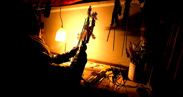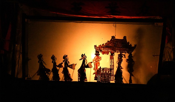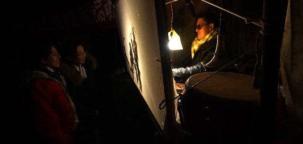 ↑2月12日,在甘肅省定西市渭源縣清源鎮(zhèn)崔家河村,民間藝人在表演皮影戲。