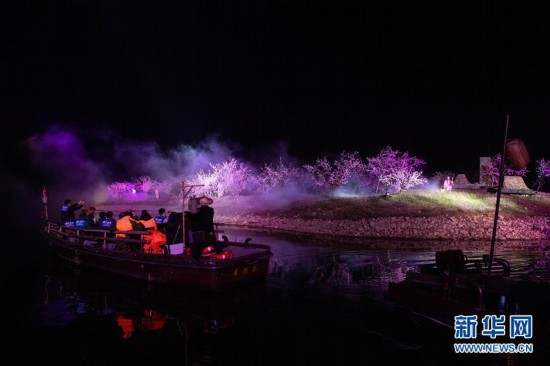 游客在湖南省常德市桃花源風(fēng)景名勝區(qū)乘船觀看實景演出《桃花源記》(2019年11月13日攝)。新華社發(fā)(陳思汗 攝)
