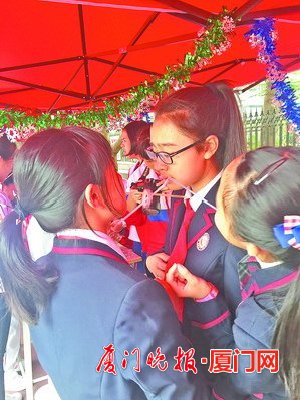 六年(2)班的陳錦璇和賴鷺宸在攝影社的攤位前玩起游戲,她們嘴里含著吸管,用吸管傳遞一個透明膠。經過了三分鐘的嘗試,她們終于圓滿完成了任務!白彀投妓崴览玻 标愬\璇開心地說,工作人員在她們的積分卡上蓋了一個小紅章,據說,完成任務蓋滿12個紅章就可以拿到獎品了。