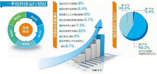 地區生產總值快速增長,經濟結構轉型升級。數據顯示,一季度GDP增速較去年同期提高0.5個百分點,增幅比1-2月提高1.2個百分點,經濟三次產業結構為0.4∶39.4∶60.2,第三產業占比超過60%,對GDP的增長貢獻率達到55.6%。工業成色不斷刷新,規上高新技術產業在規上工業中的占比高達67.1%。“互聯網+零售”增長33.0%,網上零售額占限上社會消費品零售額的29.1%。信息傳輸、軟件和信息技術服務業等重點服務業快速成長——新產業、新業態、新模式不斷壯大,經濟結構更趨優化。