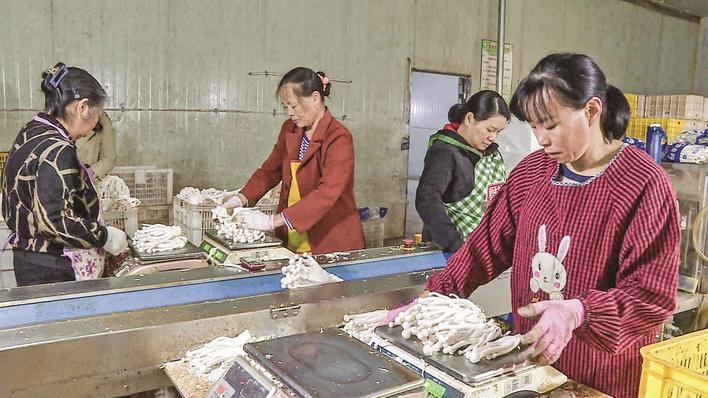 11月21日,在建寧大川生物菌業有限公司包裝車間,工人正將采摘下來的海鮮菇進行分揀、稱重、打包。