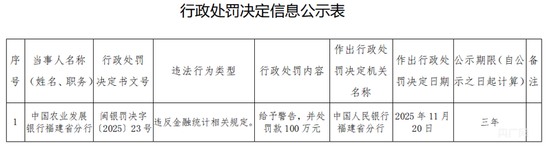 央廣網(wǎng)福州11月29日消息(記者羅曉英)近日,中國人民銀行福建省分行發(fā)布行政處罰決定信息公示表,因違反金融統(tǒng)計相關(guān)規(guī)定,中國農(nóng)業(yè)發(fā)展銀行福建省分行被警告,并處罰款100萬元。