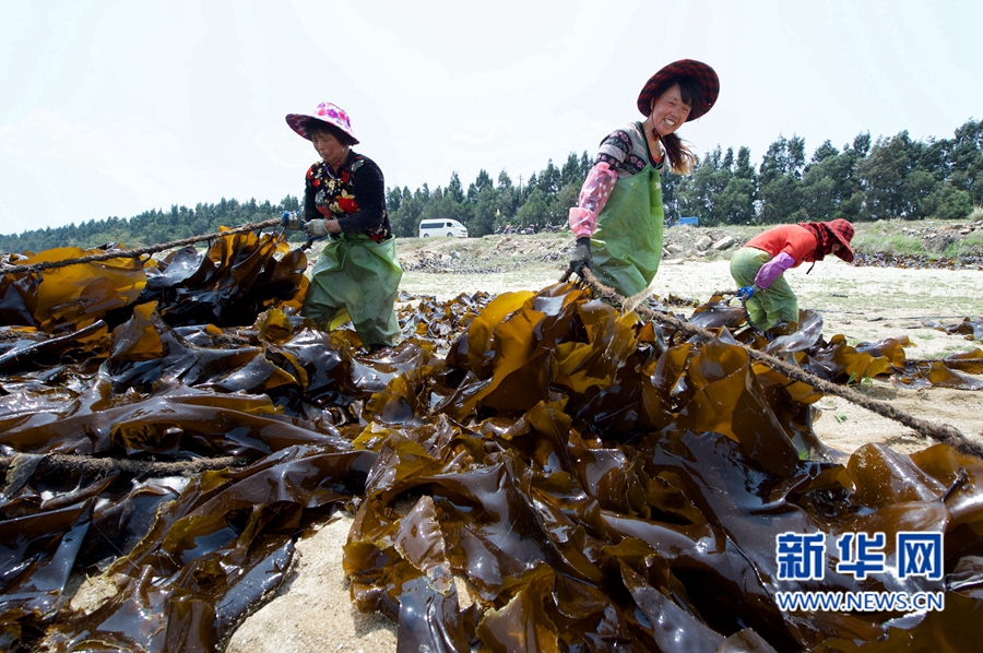 •      福建省湄洲灣北岸山柄村村民在晾曬海帶。新華社記者姜克紅 攝
