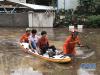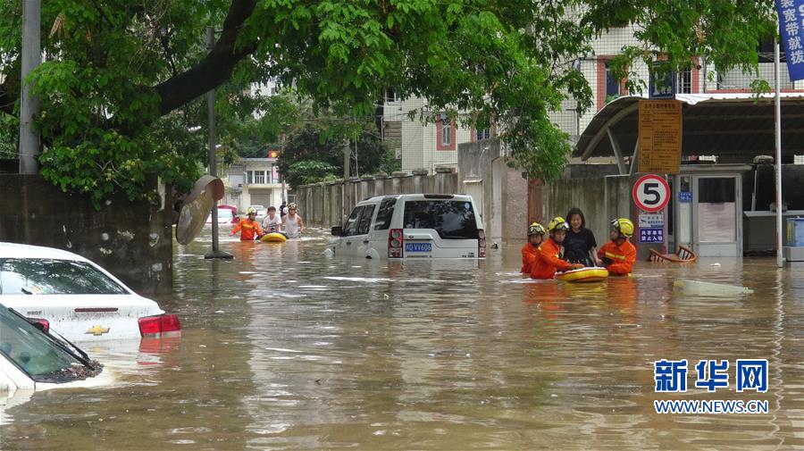 5月7日,在積水嚴(yán)重的廈門(mén)市思明區(qū)東坪山路,消防官兵轉(zhuǎn)移被困人員。新華社發(fā) -