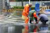 5月7日,環(huán)衛(wèi)工人在廈門(mén)市思明區(qū)會(huì)展北路積水路段清理下水道。新華社發(fā)(曾德猛 攝) -