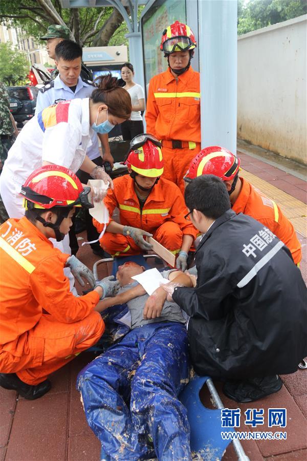 5月7日,在廈門(mén)市五緣灣路,倒塌的圍墻壓住一名行人,消防官兵和醫(yī)護(hù)人員為其緊急救護(hù)。新華社發(fā)(曾德猛 攝)