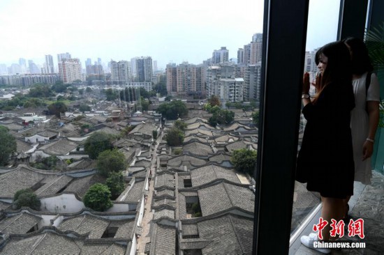 7月8日,從高處鳥瞰有“中國明清建筑博物館”之稱的福州三坊七巷,蔚為壯觀。位于福州中心城區的三坊七巷擁有38公頃的完整保護范圍,為國內現存規模較大、保護較為完整的歷史文化街區,是全國為數不多的古建筑遺存之一,有“中國城市里坊制度活化石”和“中國明清建筑博物館”的美稱。中新社記者 王東明 攝