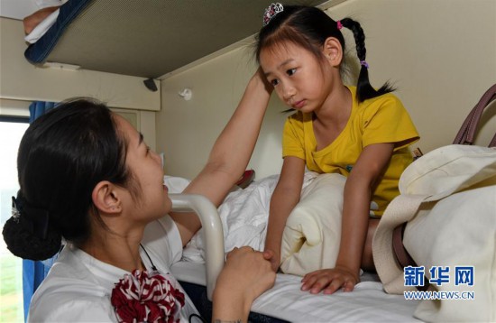 7月8日,在福州開往北京西的Z60次列車上,乘務員在照顧一位父母在北京工作的小朋友。進入暑期,眾多小“候鳥”踏上旅途,回到在外工作的父母身邊,開始短暫的暑期生活。 新華社記者張國俊攝