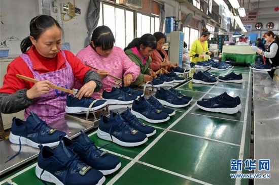 2月21日,莆田市一家鞋業有限公司工人在生產運動鞋。