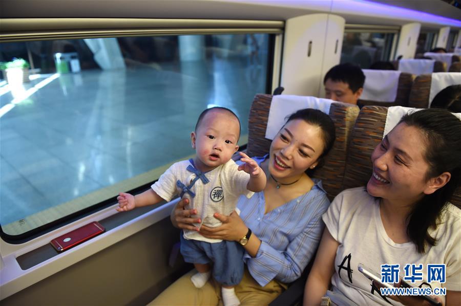 6月26日,6個半月的小朋友皇甫嘉曄跟隨家人乘坐“復興號”G123次列車。 當日,中國標準動車組“復興號”在京滬高鐵兩端的北京南站和上海虹橋站雙向首發,分別擔當G123次和G124次高速列車。“復興號”是由中國鐵路總公司牽頭組織研制、具有完全自主知識產權、達到世界先進水平的中國標準動車組。 新華社記者鞠煥宗攝 -